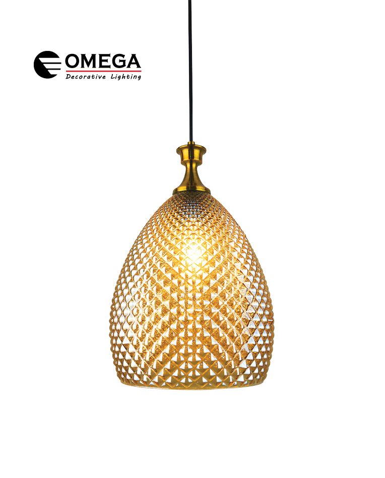 גוף תאורה דקורטיבי מעוצב בסגנון וינטג' דגם אננס, כבל תליה מתכוונן עד 1 מטר, גוף צבע פליז זכוכית ענבר