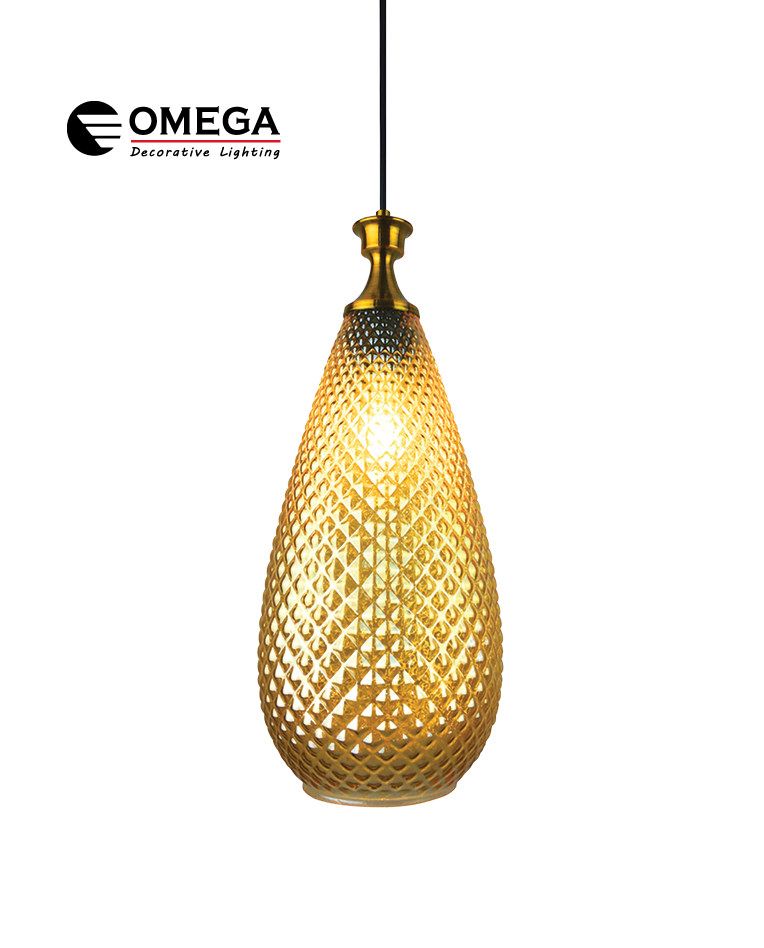 גוף תאורה דקורטיבי מעוצב בסגנון וינטג' דגם אנונה, כבל תליה מתכוונן עד 1 מטר, גוף צבע פליז זכוכית ענבר