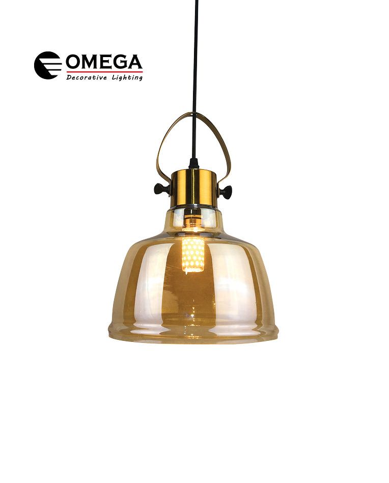 גוף תאורה דקורטיבי מעוצב בסגנון וינטג' דגם קלארין, כבל תליה מתכוונן עד 1 מטר, גוף צבע פליז זכוכית ענבר