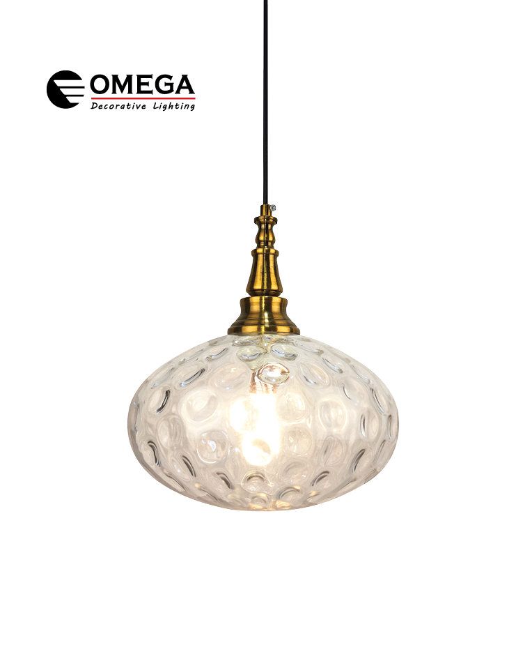 גוף תאורה דקורטיבי מעוצב בסגנון וינטג' דגם קריסטל, כבל תליה מתכוונן עד 1 מטר, גוף צבע פליז זכוכית שקופה