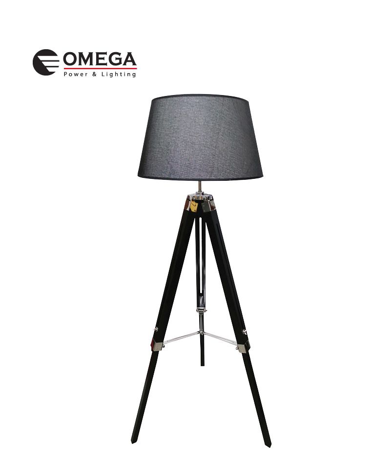 מנורת עמידה מעוצבת בסגנון קלאסי, רגלי המנורה מעץ טבעי אהיל בד שחור, אורך כבל כ-3.6 מטר, מפסק ON/OFF