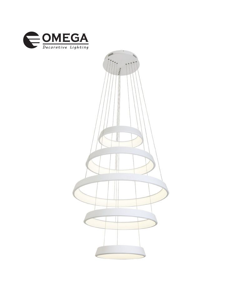 גוף תאורה דקורטיבי תלוי, דגם רינג המורכב מחמישה גופים, גובה הגופים ניתן לשליטה ועיצוב ייחודי